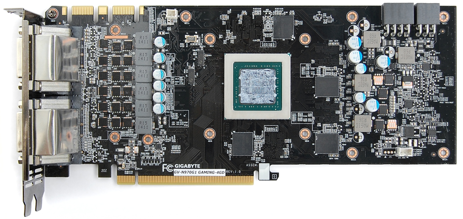 Gigabyte предлагает существенный заводской разгон ядра при базовой частоте в 1178 МГц и Boost Clock 1329 МГц. Разница между базовой частотой и Boost у данного видеоадаптера особенно большая. К примеру, у MSI GTX 970 Gaming заводские частоты 1140/1259 МГц. Память GDDR5 обходится без разгона и работает на эффективной частоте обмена данными 7012 МГц.