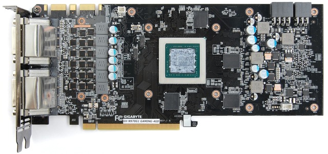 Задняя панель практически лишена вентиляционных отверстий. Разъемов для подключения мониторов шесть: два DVI, три DisplayPort и один HDMI. Один DVI поддерживает возможность аналогового вывода изображения через переходник на D-Sub.