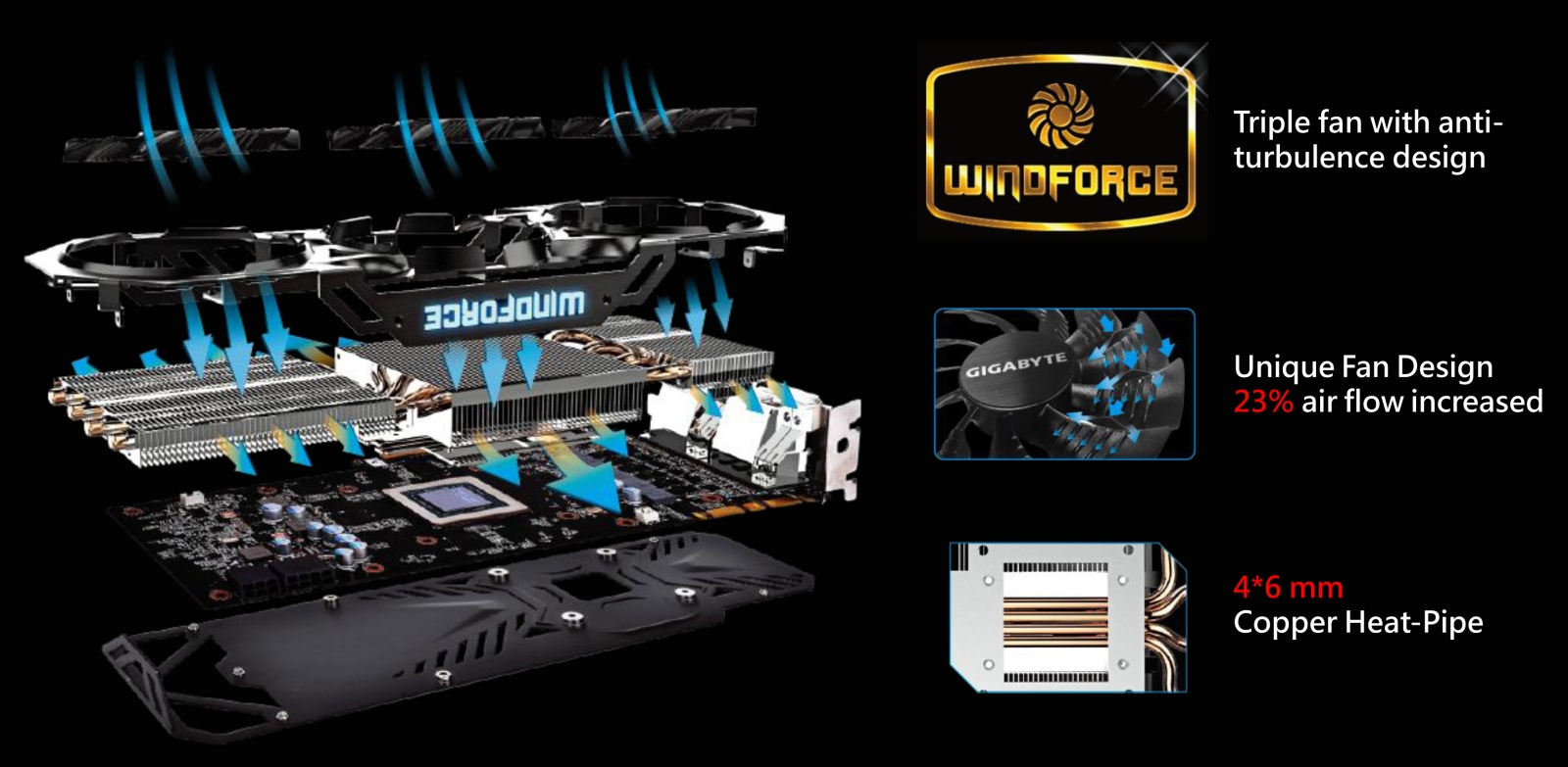 Кожух особой изогнутой формы с множеством прорезей. На боковой грани находится большая подсвечиваемая надпись WindForce. Обращает на себя внимание то, что сбоку платы вместо двух шестиконтактных разъемов питания реализовано сочетание разъемов на 6 и 8 контактов.