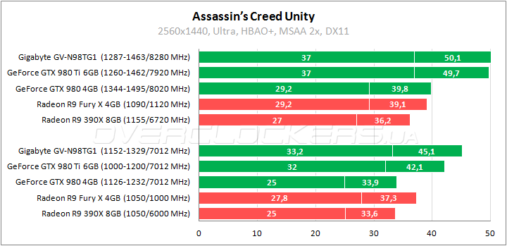 Последняя часть Assassin’s Creed при не самом высоком качестве сглаживания оказывается крепким орешком для старших AMD Radeon. Зато GeForce GTX 980 Ti легко преодолевает рубеж в 30 fps. Gigabyte лучше референса на 4–7% в номинале. В разгоне он выигрывает у товарища около 1%.