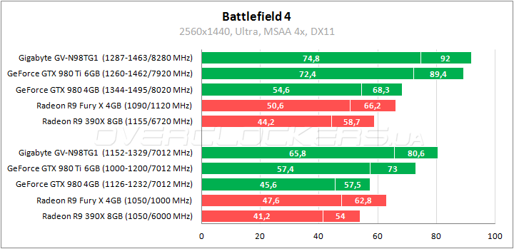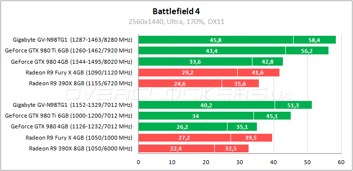 При обычном сглаживании MSAA в Battlefield 4 видеоадаптеры AMD вновь плетутся позади. Даже у простого GeForce GTX 980 Ti отрыв от Radeon R9 Fury X велик настолько, что последний не перекрывает его разгоном. Gigabyte быстрее обычной версии на 10–15%. В разгоне между ними разница до 3%.