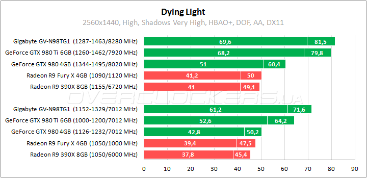 В Dying Light рассматриваемый видеоадаптер демонстрирует преимущество над референсом 12–16% и отрыв более 50% от Radeon R9 Fury X. Прирост от разгона до 14%.