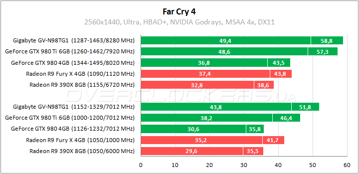 Привычное первое место за Gigabyte и в Far Cry 4. Разница с референсом 12–15%. Разогнанный лидер AMD слабее на 17–18%.