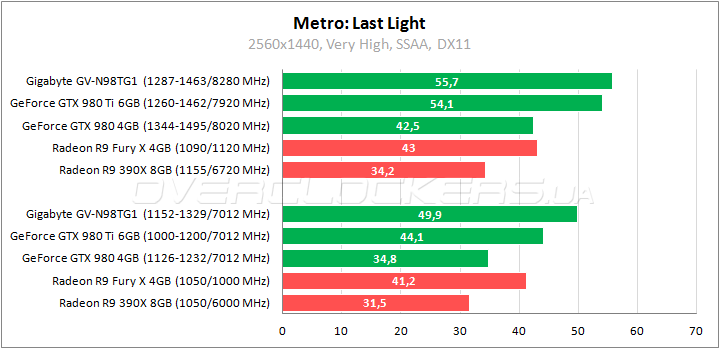 Gigabyte в Metro: Last Light демонстрирует очень высокий fps не только в простом режиме, но и при тяжелом сглаживании SSAA. Преимущество над Radeon R9 Fury X до 21%.