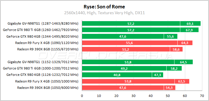 Игра Ryse хорошо себя чувствует на системе с видеокартами Radeon. И тут действительно Radeon R9 Fury X удается обойти обычную версию GeForce GTX 980 Ti. Первое место все равно за Gigabyte, хотя и с минимальным преимуществом над старшим Radeon.