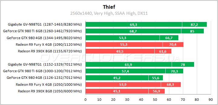 Ничего нового не демонстрируют и результаты Thief. Gigabyte на первом месте, а Radeon R9 Fury X даже с повышенными частотами слабее. Впрочем, стоит помнить, что для AMD можно включить рендеринг в Mantle, который обеспечивает стабильное ускорение.