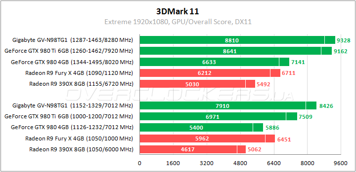 В обоих режимах лидерство Gigabyte неоспоримо. Преимущество над референсом более 15%, выигрыш у Radeon R9 Fury X примерно 10–20%.