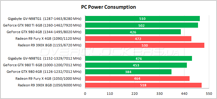 Показатели потребляемой энергии немного превышают результаты референсной версии GeForce GTX 980 Ti и Radeon R9 Fury X. Самые высокие показатели у Radeon R9 390X.