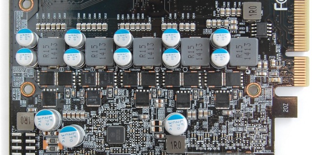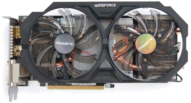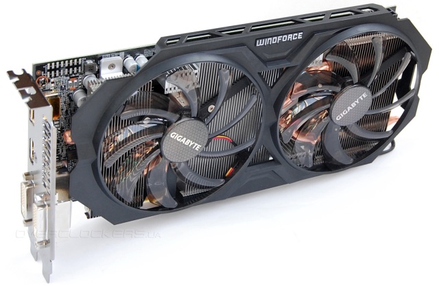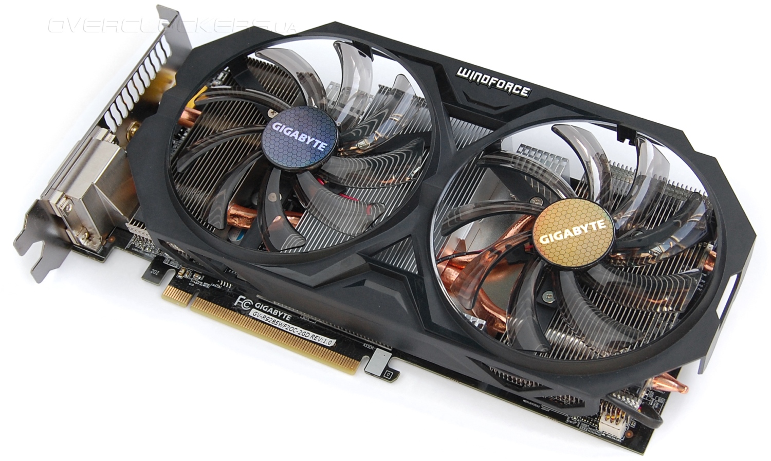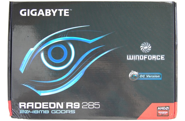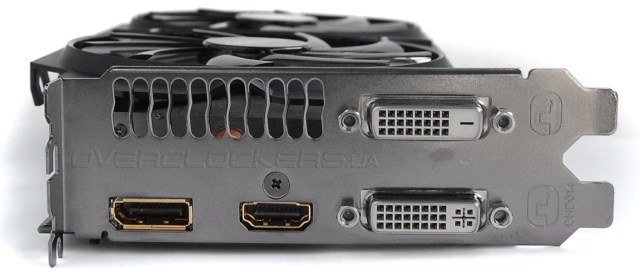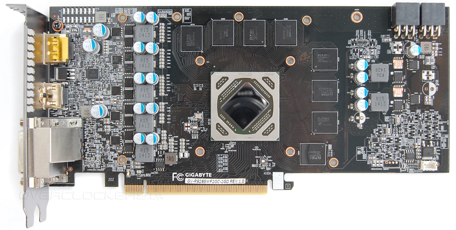 Все выполнено в стандартном для линейки продуктов WindForce дизайне. Сочетание крупных прозрачных вентиляторов и массивного радиатора под ними выглядит солидно. Сбоку отсутствуют контактные площадки для мостика CrossFireX. Radeon R9 285, как и Radeon R9 290/290X, не нужна дополнительная коммуникация для работы в таком режиме. Обмен данными в CrossFireX идет исключительно по шине PCI Express.