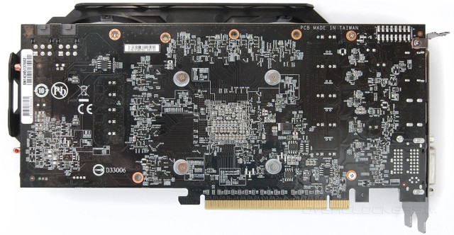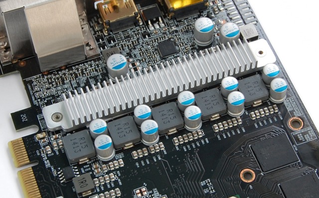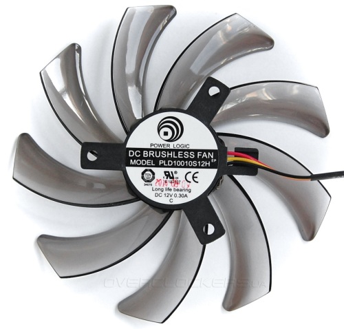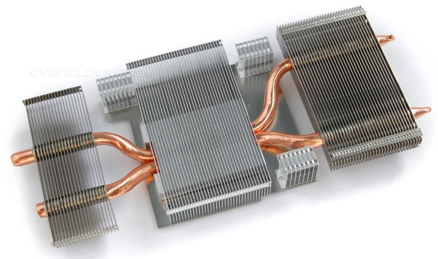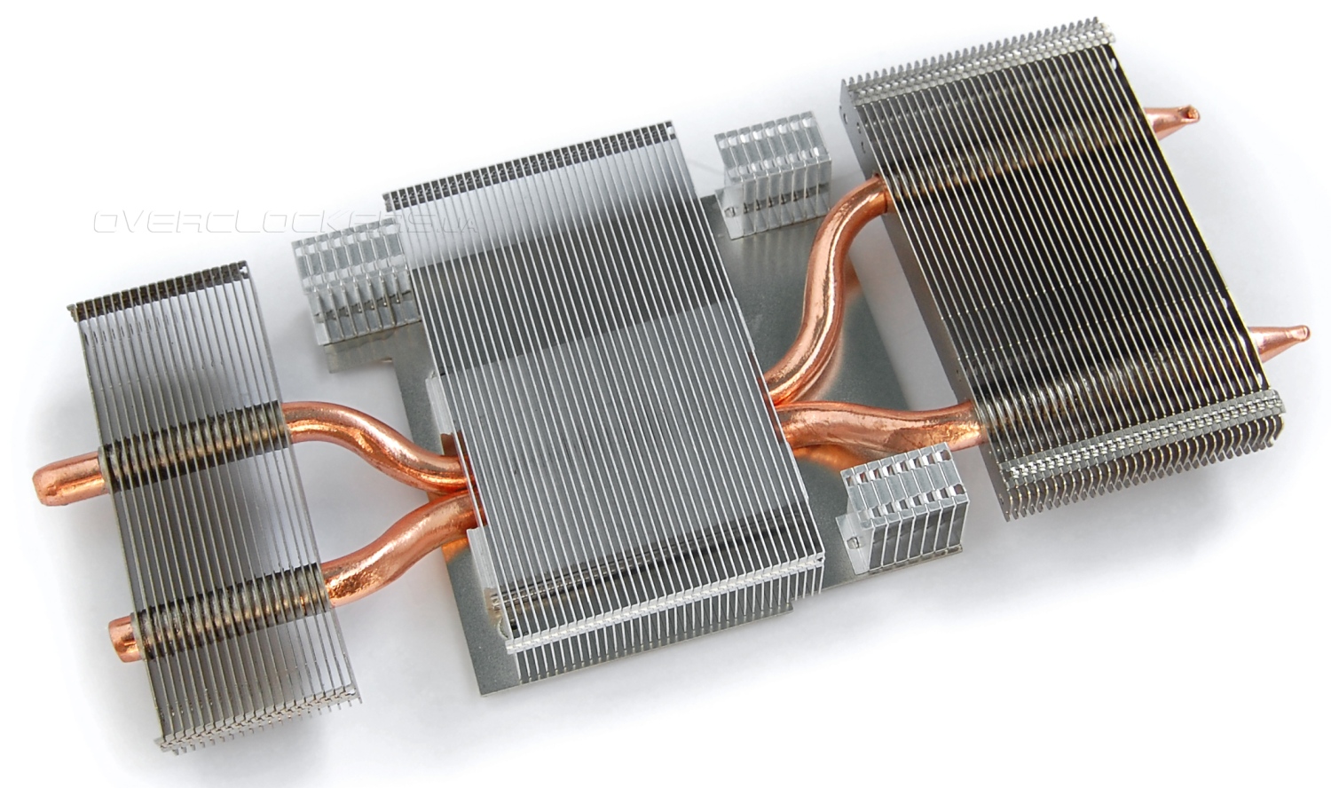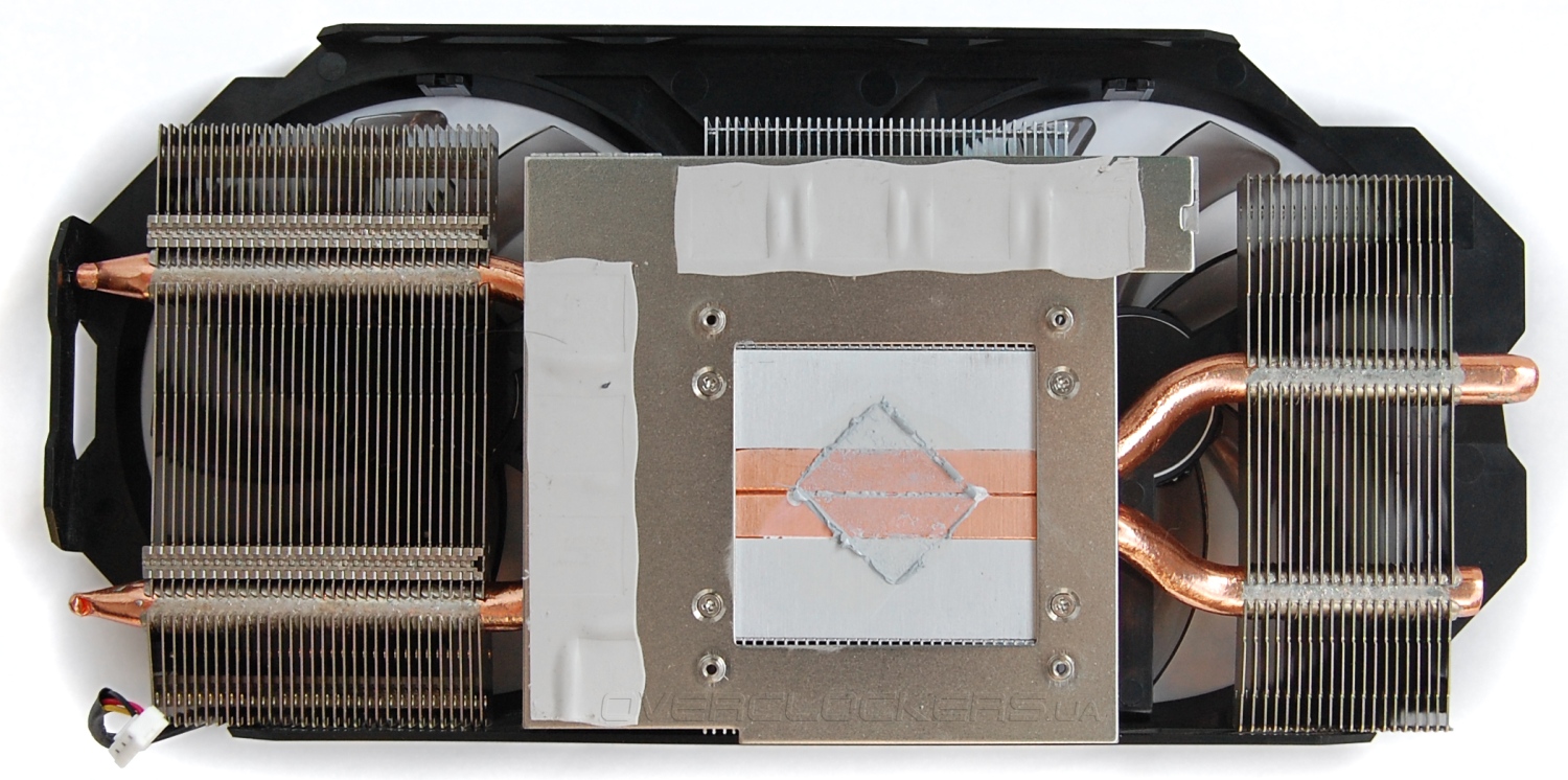 В основании кулера расположена широкая пластина, накрывающая все микросхемы памяти. В центральной части радиатора имеется массивный сердечник, который пронизывает пара толстых медных трубок. Эти тепловые трубки диаметром 8 мм напрямую контактируют с поверхностью кристалла GPU.