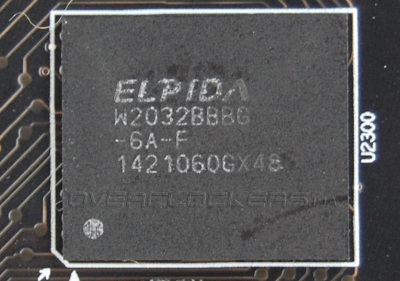 Два гигабайта памяти набраны восемью микросхемами Elpida W2032BBBG-6A-F. У MSI использовались такие же чипы.