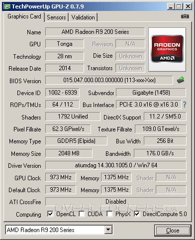 Рабочие частоты Gigabyte GV-R9285WF2OC-2GD строго соответствуют частотам MSI R9 285 Gaming 2G — ядро работает на 973 МГц, память на 5500 МГц. Стандартная конфигурация 918/5500 МГц.