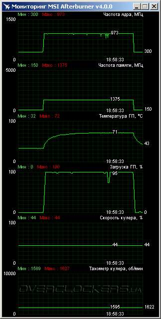Gigabyte оказался холоднее MSI Gaming, но последний и тише. Поэтому было решено проверить потенциал GV-R9285WF2OC-2GD при более низких оборотах. Снизив скорость вентиляторов до уровня 1600 об/мин, вышли на температурные показатели в 71–72 °C, что примерно на уровне Gaming.