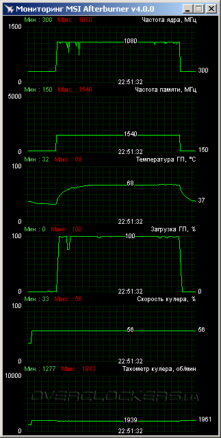 В разгоне ничего удивительного видеокарта не продемонстрировала. По ядру выше 1080 МГц шагнуть не удалось из-за потери стабильности. Память одолела 6160 МГц.