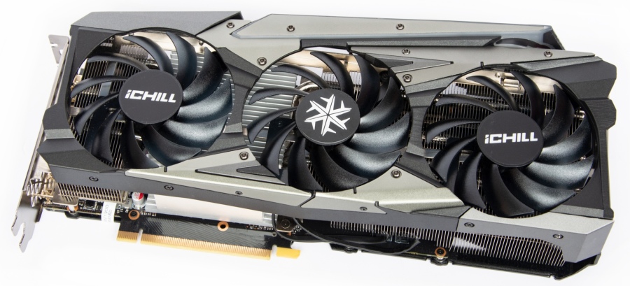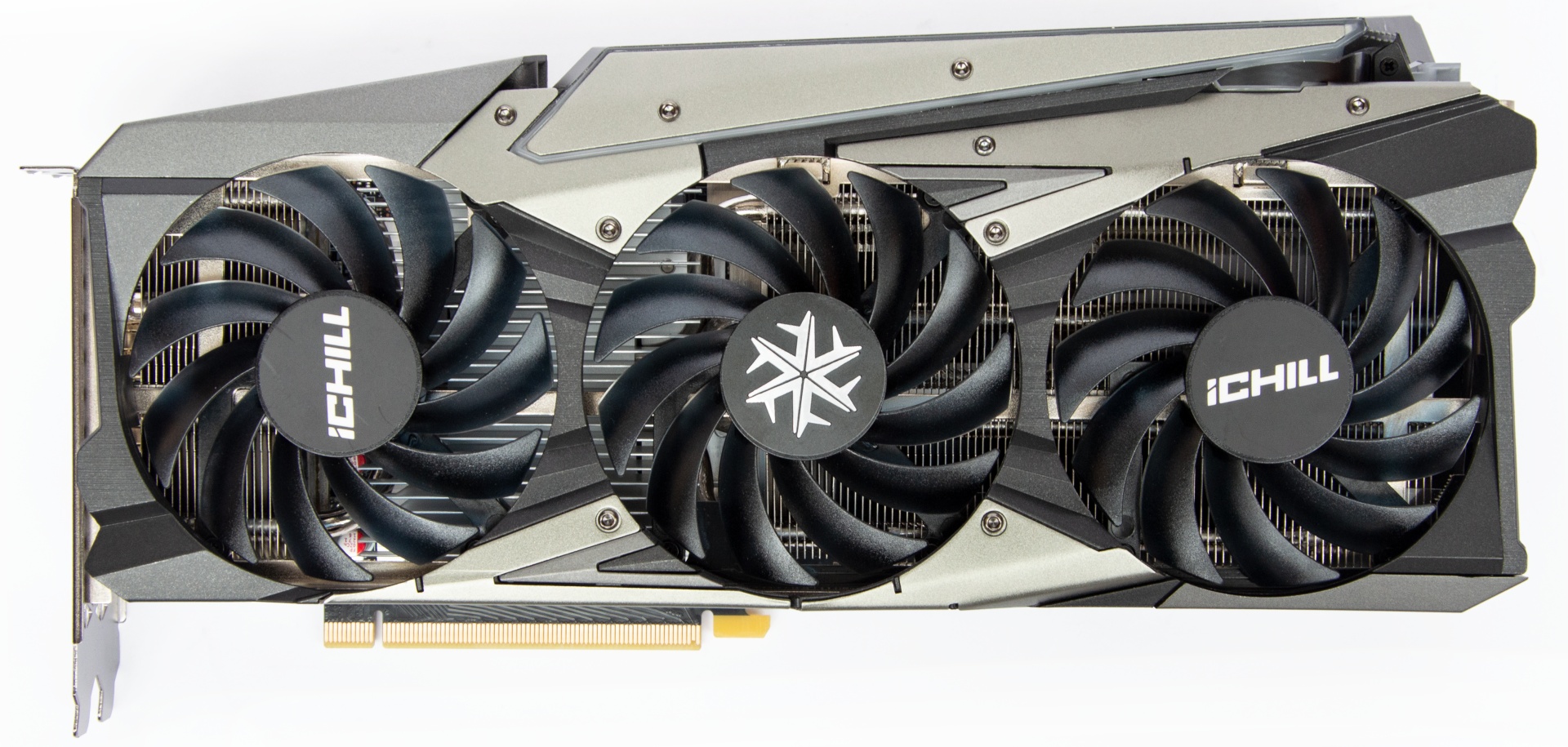 В наши руки попала модель из линейки iChill, что предполагает мощное крупногабаритное охлаждение с несколькими вентиляторами. Поставляется видеокарта в крупной коробке.