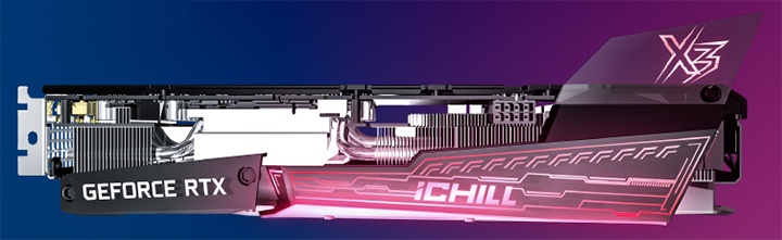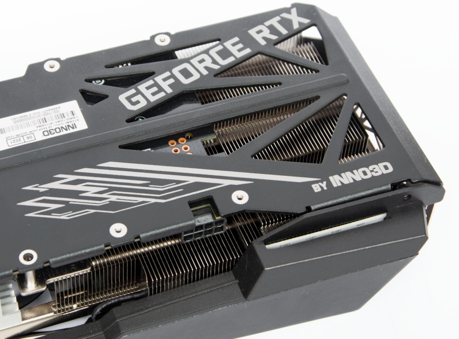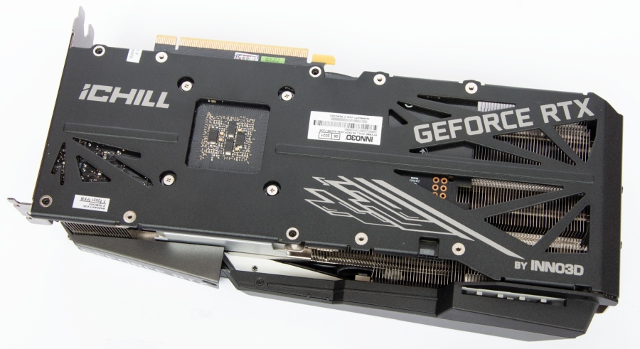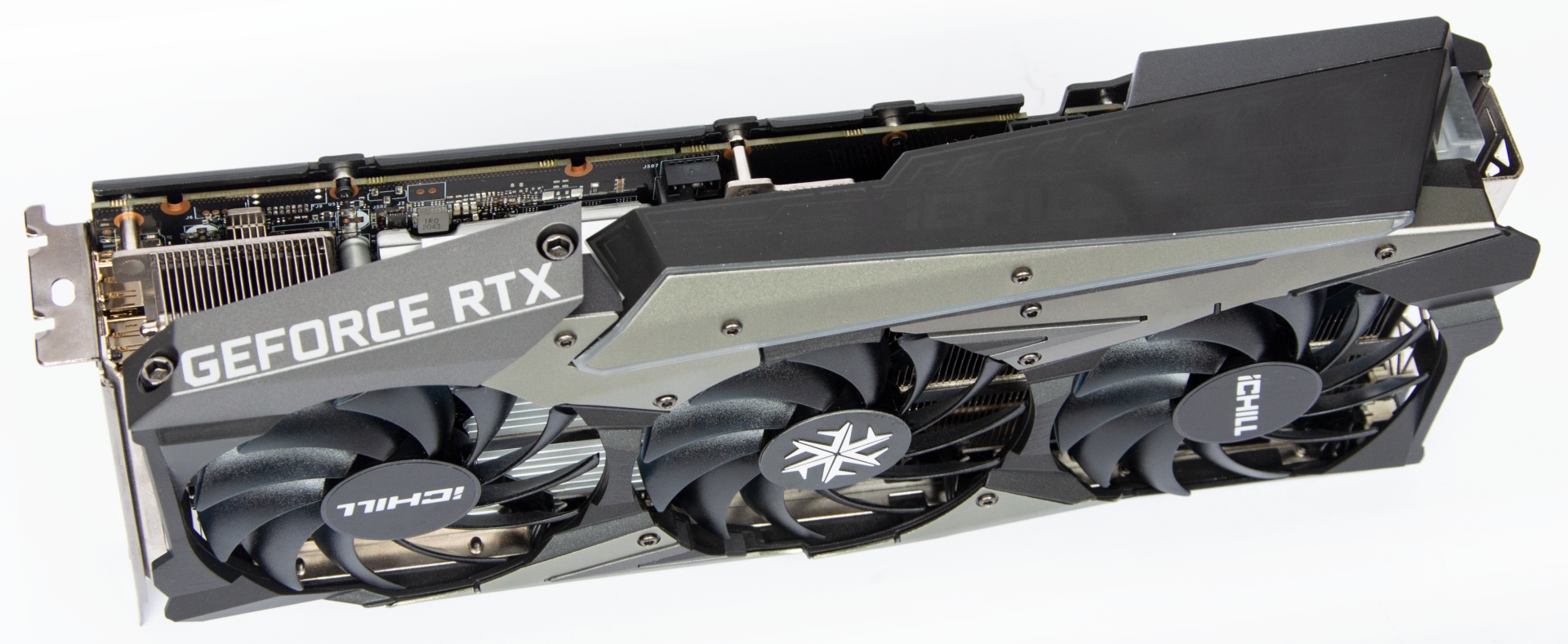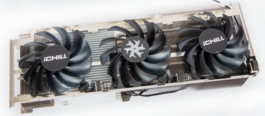 INNO3D использует единый радиатор для всех элементов. Для контакта с микросхемами памяти и силовыми элементами присутствуют соответствующие площадки.