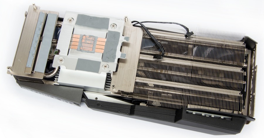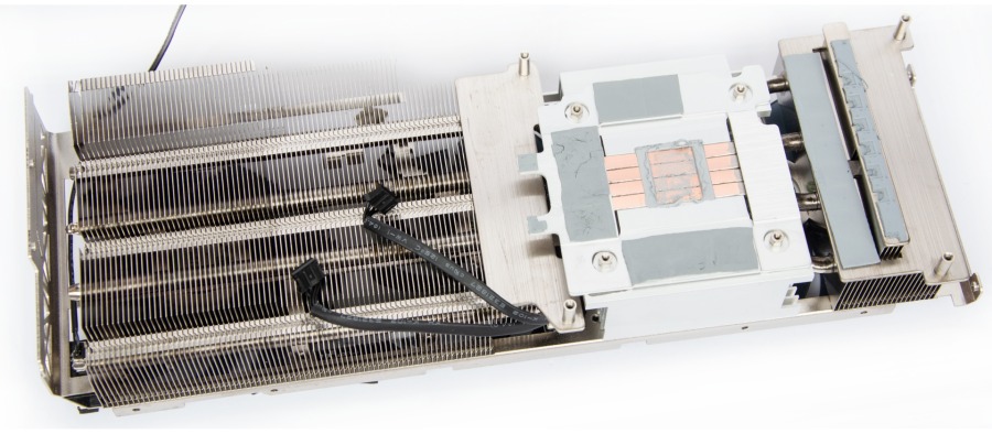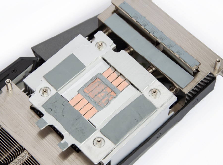 Реализован прямой контакт тепловых трубок с графическим чипом. Четыре трубки полностью перекрывают площадь кристалла, но качество подгонки трубок друг к другу не идеальное, как и качество шлифовки основания. Неровности и канавки между трубками компенсируются термопастой. Вокруг этой зоны расположена пластина для охлаждения микросхем памяти.
