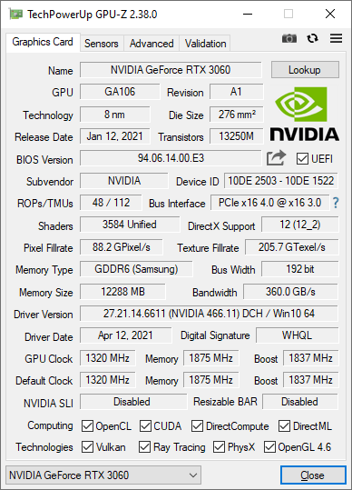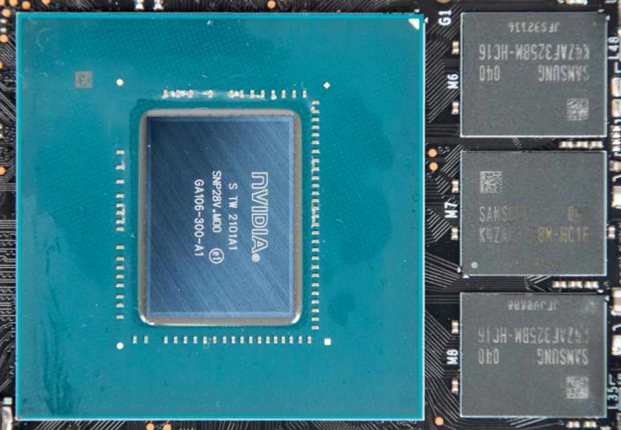 Полная маркировка процессора GA106-300-A1. 12 гигабайт памяти набрано шестью микросхемами Samsung K4ZAF325BM-HC16.