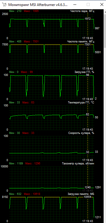 Реальные частоты Boost держались в рамках 1927–1980 МГц. В большинстве игр это 1972–1980 МГц (ниже на скриншоте — Horizon Zero Dawn), в самых тяжелых тестах ближе 1930–1950 МГц (ниже на скриншоте — стресс-тест 3DMark Time Spy). Пиковое значение Boost 1995 МГц.