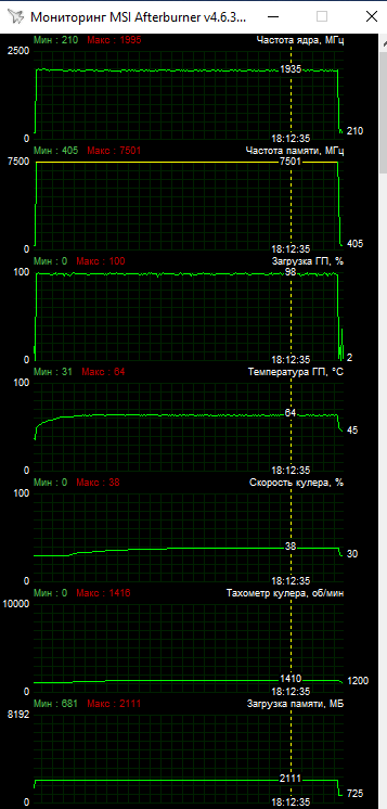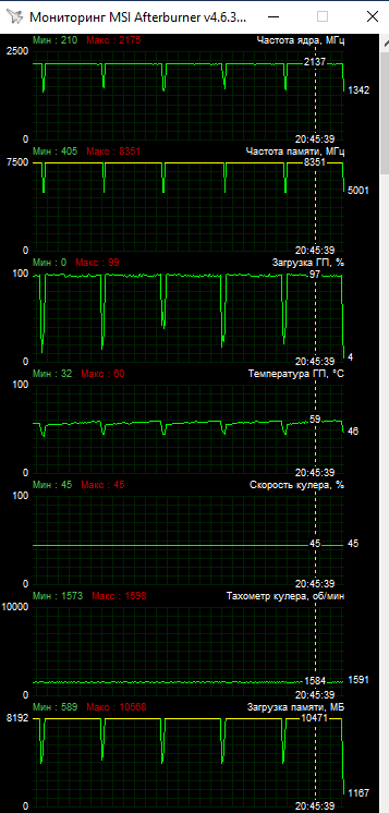 Во многих играх частоты GPU превышали 2100 МГц, в редких приложениях и в стресс-тесте 3DMark Time Spy были просадки до 2077–2100 МГц. Пиковое значение составило 2175 МГц. При фиксации вентиляторов на 1400 об/мин удалось сохранить нагрев на начальном уровне.