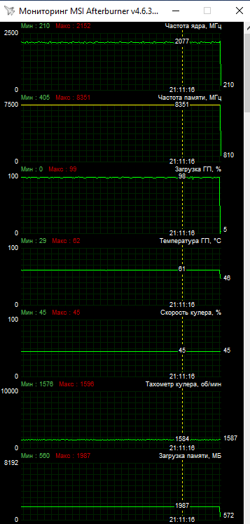 Разгон осуществлялся с помощью MSI Afterburner. Лимит мощности заблокирован на повышение, что присуще всей серии GeForce RTX 3060. Это не помешало поднять частоту ядра на 170 МГц с рабочим Boost около 2100 МГц, память смогла функционировать при частоте 16700 МГц.
