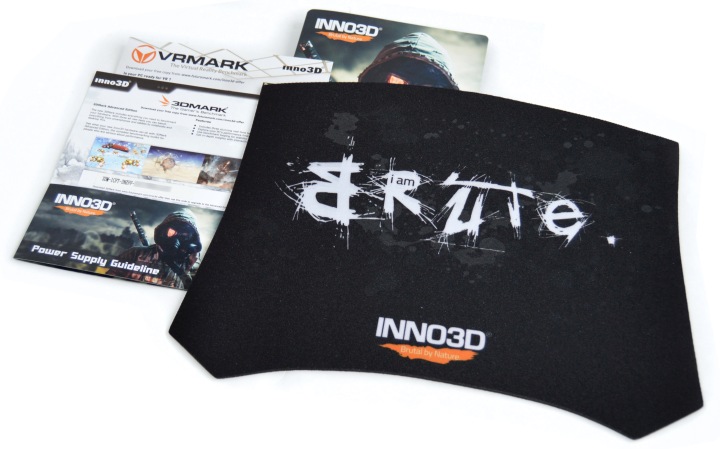 Времена, когда производители комплектовали свои продукты дополнительными аксессуарами, постепенно ушли в прошлое. Но Inno3D не скупится на приятные бонусы для покупателя. Внутри коробки есть фирменный коврик и коды тестовых программ 3DMark и VRMark, плюс диск с программным обеспечением и краткая инструкция.