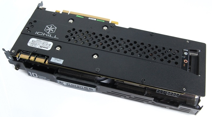 Также предусмотрена вариативная подсветка бокового логотипа iChill, где цвет сигнализирует о загрузке. При синем свечении видеокарта работает в простом 2D-режиме, при зеленом — легкая нагрузка, при красном уже максимальная 3D-нагрузка.