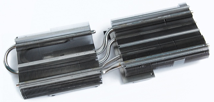 Взглянем ближе на систему охлаждения. Под кожухом скрывается двухсекционный радиатор. Одна секция имеет крупное основание для контакта с GPU, на другой секции присутствует контактная площадка для силовых элементов VRM.