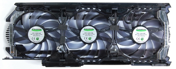 За обдув отвечают три вентилятора Colorful CF-12915S типоразмера 90 мм. Пластиковый кожух закован в металлическую «броню», которую нам так и не удалось снять. При этом даже процесс одевания этого корпуса на радиатор сопряжен с проблемами из-за высокой жесткости металлических элементов. В старых видеокартах Inno3D iChill было намного лучше, они хоть и напоминали конструктор, но все можно было аккуратно раскрутить и заново собрать.