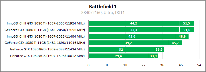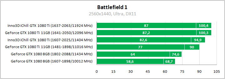 Inno3D iChill быстрее обычной версии GeForce GTX 1080 Ti на 5–8% в Battlefield 1. В разгоне товарищи равны. У обоих существенный отрыв от GeForce GTX 1080.