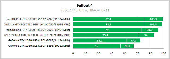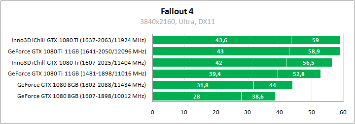 В Fallout 4 младший GeForce GTX 1080 справляется только с более низким разрешением 2560x1440, а всем версиям GeForce GTX 1080 Ti по плечу режим 4K. Максимальная разница между видеокартами в самом тяжелом режиме, где Inno3D iChill демонстрирует отрыв около 7% относительно референсного напарника. В разгоне преимущество Inno3D мизерное.