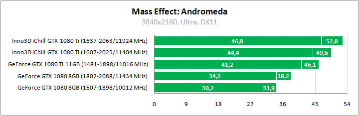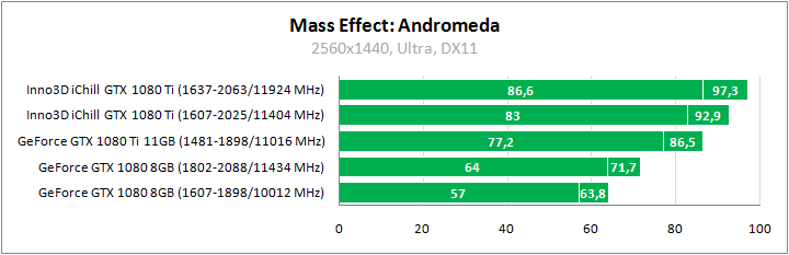 При тестировании в Mass Effect сделан акцент на герое обзора, поэтому ограничимся результатами в разгоне только для Inno3D.