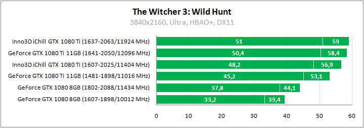 Оба видеоадаптера GeForce GTX 1080 Ti отлично справляются с Witcher 3 в режиме WQHD и демонстрируют до 60 fps при разгоне в 4K. У Inno3D iChill традиционное преимущество над референсом около 7%. В разгоне товарищи примерно на одном уровне, разница между ними минимальная.