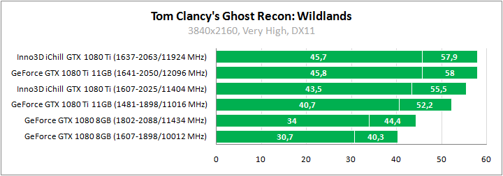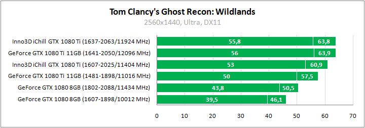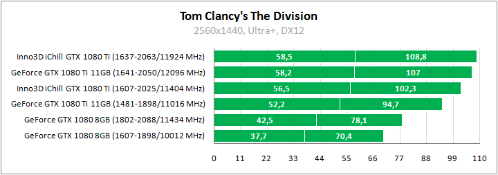 В The Division разница между двумя вариантами GeForce GTX 1080 Ti достигает 8–9%. В разгоне отрыв Inno3D iChill от напарника мизерный.