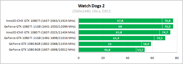 iChill GeForce GTX 1080 Ti X3 Ultra выигрывает традиционные 7% у референса в Watch Dogs 2. А вот в разгоне обе версии GeForce GTX 1080 Ti демонстрируют близкие показатели. Высокую частоту кадров в режиме 4K удается обеспечить при сочетании Ultra-настроек и параметра «временной фильтрации».