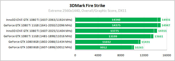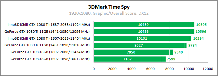 Inno3D iChill выигрывает у напарника по серии более 6%, прирост от разгона чуть более 3%. При повышении частот оба варианта GeForce GTX 1080 Ti демонстрируют идентичные результаты.
