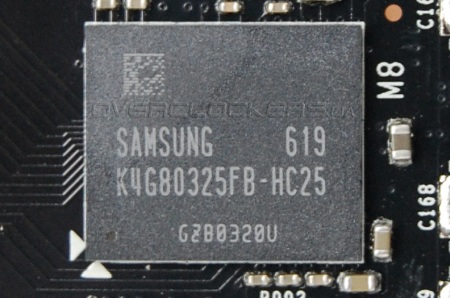 Память GDDR5 работает на шине разрядностью 192 бита. Распаяно шесть микросхем Samsung K4G80325FB-HC25.