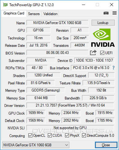 Рассматриваемая модель является старшей версией GeForce GTX 1060 со всеми вычислительными блоками и 6 ГБ памяти. Поэтому в активе GPU GP106 полная конфигурация из 1280 потоковых процессоров и 48 текстурных блоков.