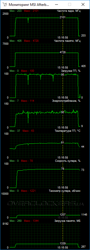 Повышение лимита мощности обеспечило стабильные 2101 МГц без просадок ниже этого уровня. Не пришлось прибегать к ручному контролю вентиляторов. В автоматическом режиме охлаждение легко справилось со своей задачей. Нагрев ядра вырос до скромных 63 °C при удержании скорости вентиляторов на уровне 1200 об/мин.