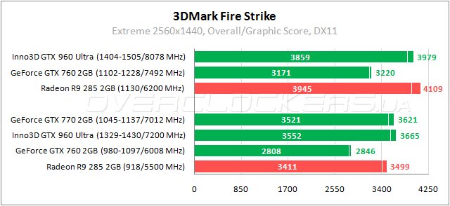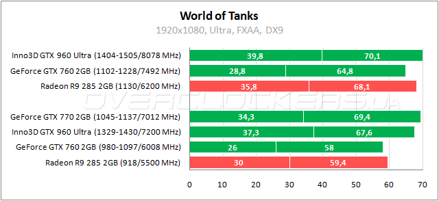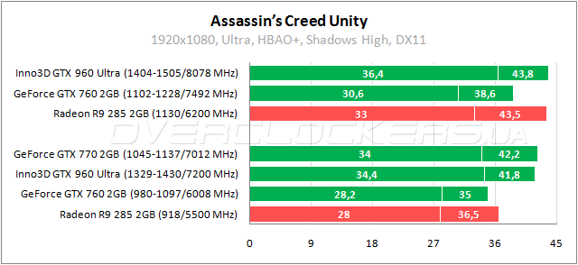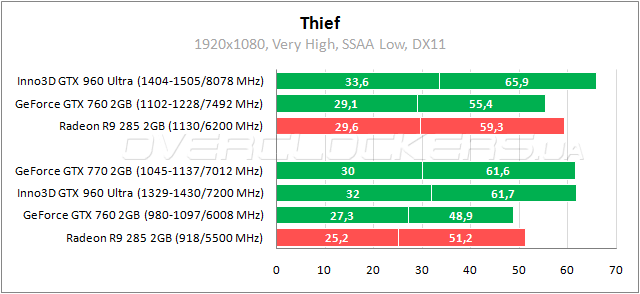 Отрыв 23–24% от GeForce GTX 760 и Radeon R9 285. Отставание от GeForce GTX 770 менее 5%. Прирост от разгона 7%.