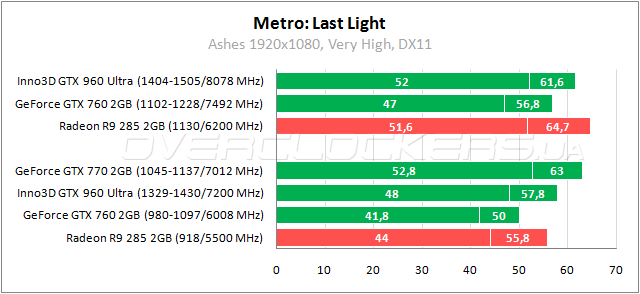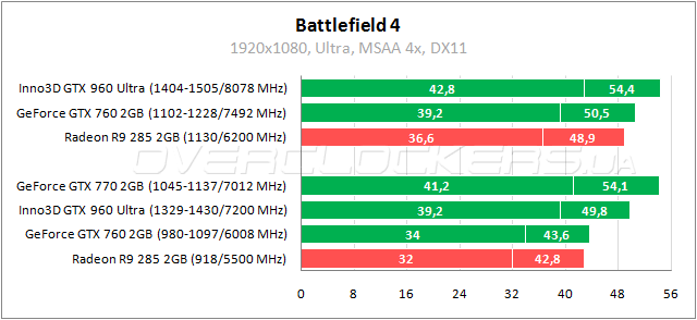В Battlefield 4 преимущество над GeForce GTX 760 составляет 14–16%. А Radeon R9 285 даже при разгоне не может нагнать Inno3D iChill. Отставание 5–9% от GeForce GTX 770, что легко перекрывается повышением частот до 1404–1505/8078 МГц.