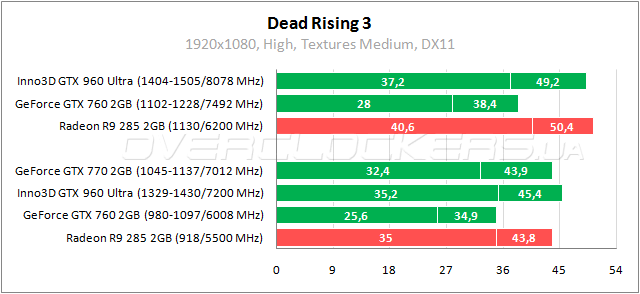 Видеоадаптер Inno3D iChill Ultra лидирует в Dead Rising 3 с отрывом 3–9% относительно GeForce GTX 770 и мизерной разницей с Radeon R9 285. Последний при разгоне выходит вперед. Новичок за счет повышения частот выигрывает 6–8% производительности.