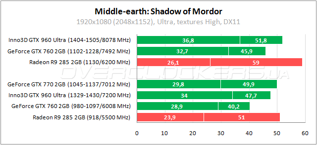 Игра Middle-earth: Shadow of Mordor при текстурах High (а это не самый высокий их уровень) требует до трех гигабайт видеопамяти. У всех наших участников просадки ниже 30 fps. Но меньше всего это заметно на GeForce GTX 960. По минимальному fps он безоговорочно лидирует, хотя по средней частоте кадров проигрывает GeForce GTX 770 и Radeon R9 285.