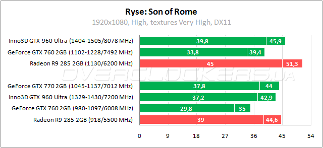 В Ryse: Son of Rome герой обзора уступает GeForce GTX 770 лишь 2%, выигрывая 23–25% у GeForce GTX 760. Отставание от конкурента AMD на уровне 4%. Прирост производительности при разгоне 7%.