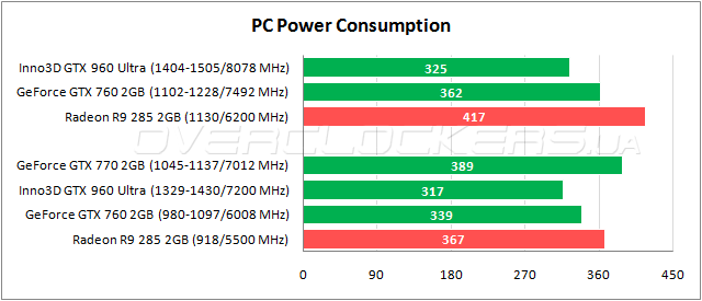 Вполне ожидаемо самые низкие показатели потребления мощности у системы с GeForce GTX 960. И разгон самой видеокарты слабо на это влияет.