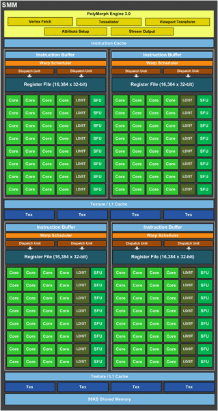 Структура SMM полностью идентична таковой у старшего процессора. У каждого 128 вычислительных блоков, восемь блоков текстурирования и свой блок обработки геометрии PolyMorph Engine. В итоге получается 1024 вычислительных и 64 текстурных блоков при 32 ROP. Ровно вдвое меньше в сравнении с полной версией GM204 у GeForce GTX 980. Объем общей кэш-памяти L2 составляет 1 МБ. Это тоже вдвое меньше, зато вдвое больше в сравнении с GK104.