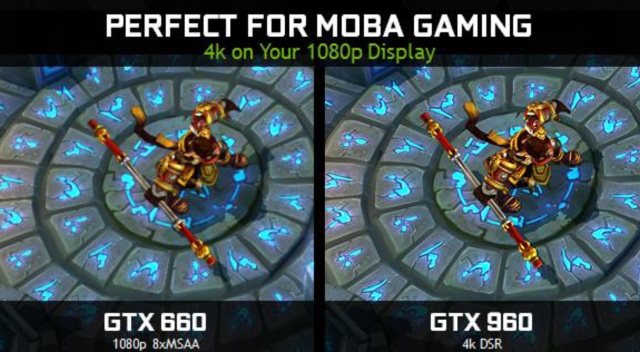 Поддерживаются все новые технологии NVIDIA, в частности, особые методы сглаживания MFAA (Multi-Frame antialiasing) и DSR (Dynamic Super Resolution). Первый вариант обеспечивает качество уровня MSAA при меньших потерях в производительности. При DSR изображение рендерится в разрешении больше экранного, обеспечивая не только сглаживание ступенчатых краев объектов, но и высокую четкость изображения. Мощности GeForce GTX 960 вполне достаточно, чтобы обеспечить 60 fps при DSR до 4K в популярных онлайновых MOBA-играх.