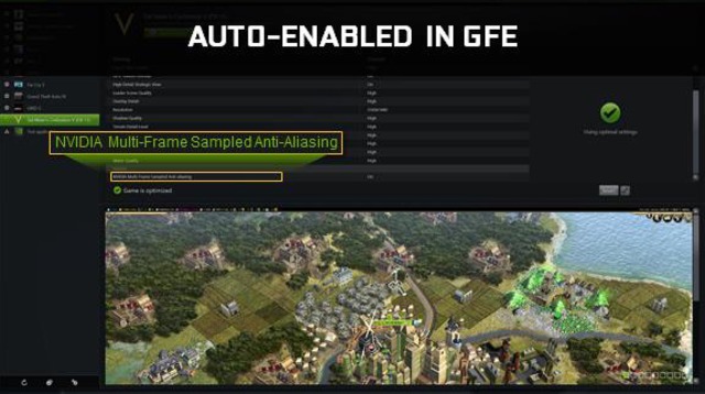 В составе программного обеспечения NVIDIA имеется приложение GeForce Experience, которое позволяет оптимизировать графические параметры игр в один клик. Теперь к автоматическим настройках добавилось и новое сглаживание MFAA, которое на данный момент работает практически во всех DirectX 10 и DirectX 11 играх.
