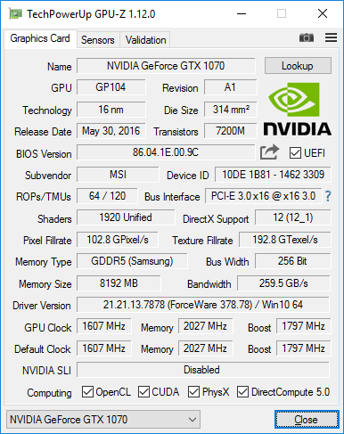 MSI GeForce GTX 1070 Duke работает на повышенных частотах. Базовая частота составляет 1607 МГц вместо рекомендуемых 1506 МГц, Boost Clock повышен с 1683 МГц до 1797 МГц, эффективная частота памяти 8100 МГц.