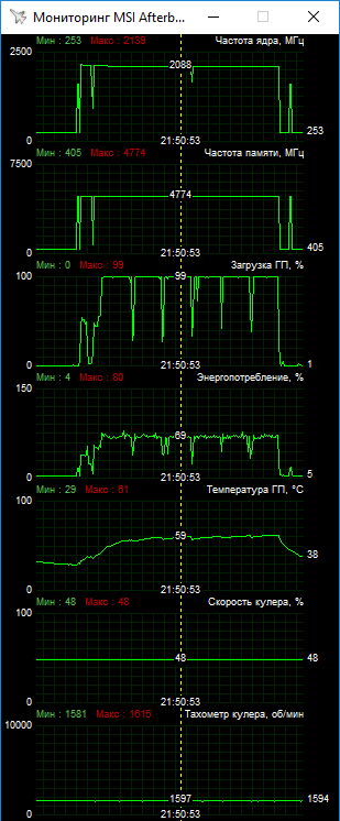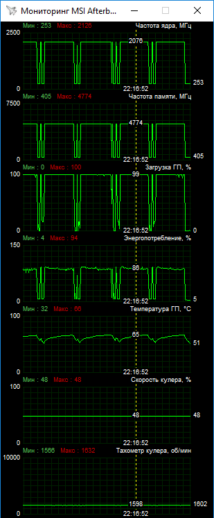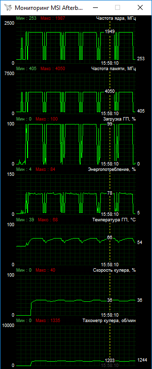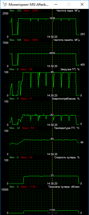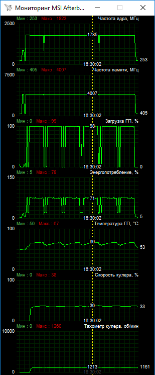 При эксплуатации на открытом стенде и температуре внутри помещения 24 °C графический чип прогревался до 64–68 °C. Ниже это проиллюстрировано на скриншотах мониторинга параметров при тестировании в Tom Clancy's Ghost Recon: Wildlands и Armored Warfare: Проект Армата. Вентиляторы раскручивались до 1100–1300 об/мин, шум при этом был минимальный. Реальная частота Boost на уровне 1936–1949 МГц при кратковременных пиковых всплесках до 1987–2000 МГц.